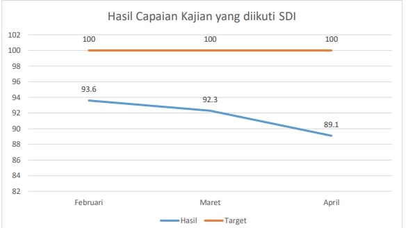 Pada bulan Februari, capaian pengajian tercatat sebesar 93,6%, menunjukkan adanya deviasi sebesar 6,4% dari target. Memasuki bulan Maret, capaian menurun menjadi 92,3%, dengan selisih terhadap target meningkat menjadi 7,7%. Penurunan ini berlanjut pada bulan April, di mana capaian tercatat hanya 89,1%, yang berarti terdapat gap sebesar 10,9% dari target.