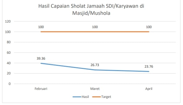 Penurunan ini berlanjut pada bulan April, di mana hanya 96 karyawan yang tercatat melaksanakan sholat berjamaah, dengan persentase 23,76% dari total keseluruhan karyawan.